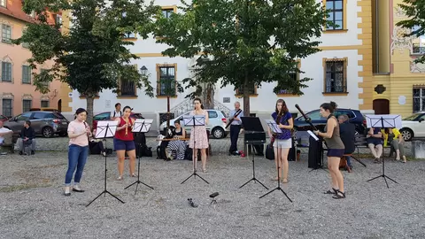 <p>Am Freitag, den 12. August werden um 19:00 Uhr die Teilnehmer der Alten Musik im Rahmen der Sommerakademie bei schönem Wetter auf dem Karlsplatz auftreten. Genießen Sie die musikalische Umrahmung.</p>