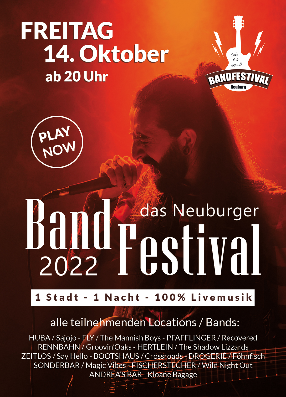 <p>Das 1. Neuburger Bandfestival findet am 14. Oktober ab 20 Uhr in verschiedenen Bars und Restaurants in der Innenstadt statt. Hier alle teilnehmenden Location-Bandpaare:</p> <p>HUBA / Sajojo</p> <p>FLY / The Mannish Boys</p> <p>PFAFFLINGER / Recovered</p> <p>RENNBAHN / Groovin' Oaks</p> <p>HERTLEIN / The Shadow Lizzards</p> <p>ZEITLOS / Say Hello</p> <p>BOOTSHAUS / Crossroads</p> <p>DROGERIE / Föhnfisch</p> <p>SONDERBAR / Magic Vibes</p> <p>FISCHERSTECHER / Wild Night Out</p> <p>ANDREA'S BAR / Kloane Bagage</p>