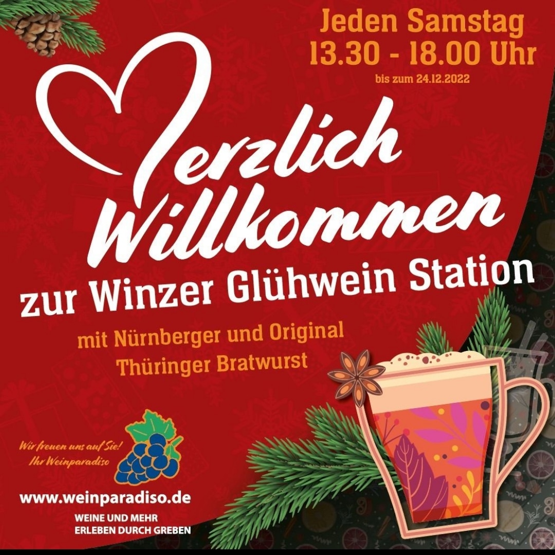 <p>An allen Adventssamstagen von 13:30 - 18:00 Uhr laden wir Euch herzlich ein, im Weinparadiso nach Geschenken zu schauen und einen Winzer-Glühwein zu genießen!</p> <p>Für den kleinen Hunger legen wir für Euch Nürnberger und Original Thüringer Bratwürste auf den Grill!</p> <p> </p> <p>Wir freuen uns auf Euch!</p> <p> </p> <p> </p>