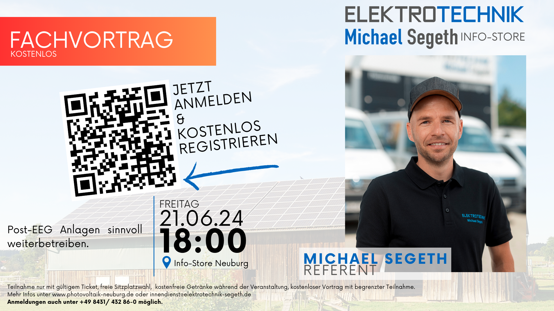 <p>Ihre Photovoltaikanlage nähert sich dem 20-jährigen Jubiläum - Damit endet auch Ihre hohe Einspeisevergütung. Es ist nun entscheidend, proaktiv zu werden!</p> <p>„Viele Anlagen sind auch nach dieser Zeitspanne noch sicher und effizient nutzbar.…“. Michael Segeth</p> <p>Es gibt verschiedene Optionen, die Sie für Ihre Ü20-PV-Anlage nach dem Auslaufen der EEG-Förderung in Erwägung ziehen können. Eine fachgerechte Beratung kann Ihnen helfen, die beste Entscheidung für Ihre Situation zu treffen.</p> <p><strong>Sichern Sie sich jetzt ein Ticket und erfahren Sie mehr zum Thema: Altanlagen sinnvoll weiterbetreiben!</strong></p> <p><strong><a href="https://app.guestoo.de/public/event/c9edc351-2bfa-407a-a82d-e9c694a8a31f" tabindex="-1">Hier</a> geht es zur kostenlosen Anmeldung.</strong></p> <p><a href="https://www.photovoltaik-neuburg.de/" tabindex="-1">Elektrotechnik Segeth</a>, <a href="https://www.photovoltaik-neuburg.de/" tabindex="-1">Photovoltaik Neuburg</a>, <a href="https://www.photovoltaik-neuburg.de/info-store" tabindex="-1">Info-Store Neuburg</a></p>