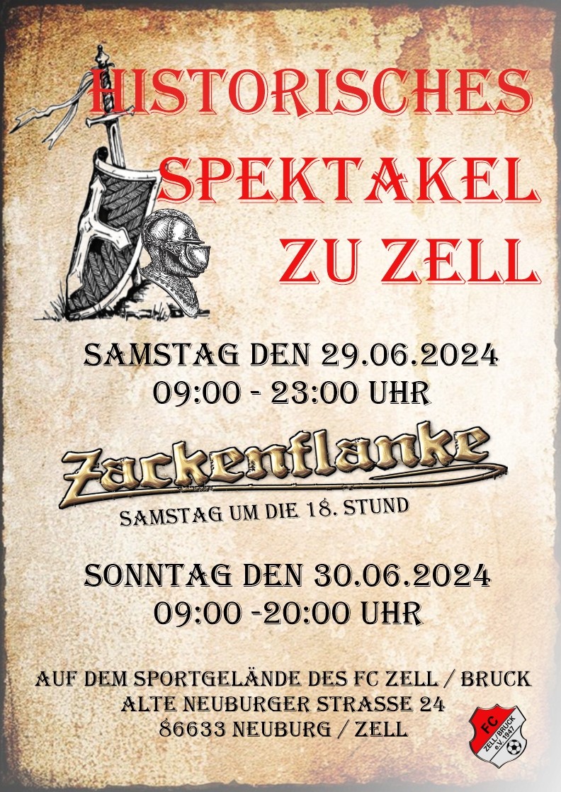 <p><strong>Seyt gegrüßt Freunde und Liebhaber der "alten Zeyt"!</strong></p> <p style="text-align:justify">Der FC Zell/Bruck veranstaltet zum zweiten Mal sein <strong>"Historisches Spektakel zu Zell" </strong>auf dem Sportgelände an der <u>Alten Neuburger Straße 24 in 86633 Neuburg an der Donau - OT.: Zell</u>.</p> <p style="text-align:justify">Es erwarten Euch sowohl wilde Recken, Landsknechte, Ritter, holde Maiden, Marktleut, etliche lagerne Gruppen, als auch die bewährten kulinarische Genüße für Gaumen und Kehle.<br /> <br /> Ein kleiner Markt mit allerley Zier, Tand und Handwerkskunst soll Euch geboten sein und wartet darauf entdeckt zu werden.</p> <p style="text-align:justify">Ein attraktives Programm was die Kruzweil betrifft soll Euch ebenfalls an beiden Tagen dargeboten werden. Lasset Euch von Bauchtänzerinnen, Feuerspuckern, Fahnenschwingern, Trommlern und der Band "Zackenflanke" in längst vergangene Zeyt entführen.</p> <p style="text-align:justify">Des Weiteren gibt es ein Spiel im Stile des "Calcio Storico" (florentinischer Fußball) zwischen einer Mannschaft des heimischen FC und der Stadtwache Neuburg.</p> <p style="text-align:justify">An beiden Tagen gibt es aber auch und vor allem für die kleinen Recken und Maiden viel zu erleben. Eine Schatzsuche, Kamele die Euch über das Gelände tragen sollen und lustige Spiele erwarten Euch. Zusätzlich könnt Ihr an einigen Ständen die alte Handwerkskunst erleben und Euch selbst daran versuchen. </p> <p style="text-align:justify">Wem also die "schlossfestfreien Zeyt" zu lang erscheint, der sei herzlich willkommen auf unserem </p> <p style="text-align:justify"><strong>"Historischen Spektakel zu Zell"</strong><br /> </p> <p>Wir freuen uns auf Euch<br /> Euer FC Zell/Bruck e. V.<br /> </p>
