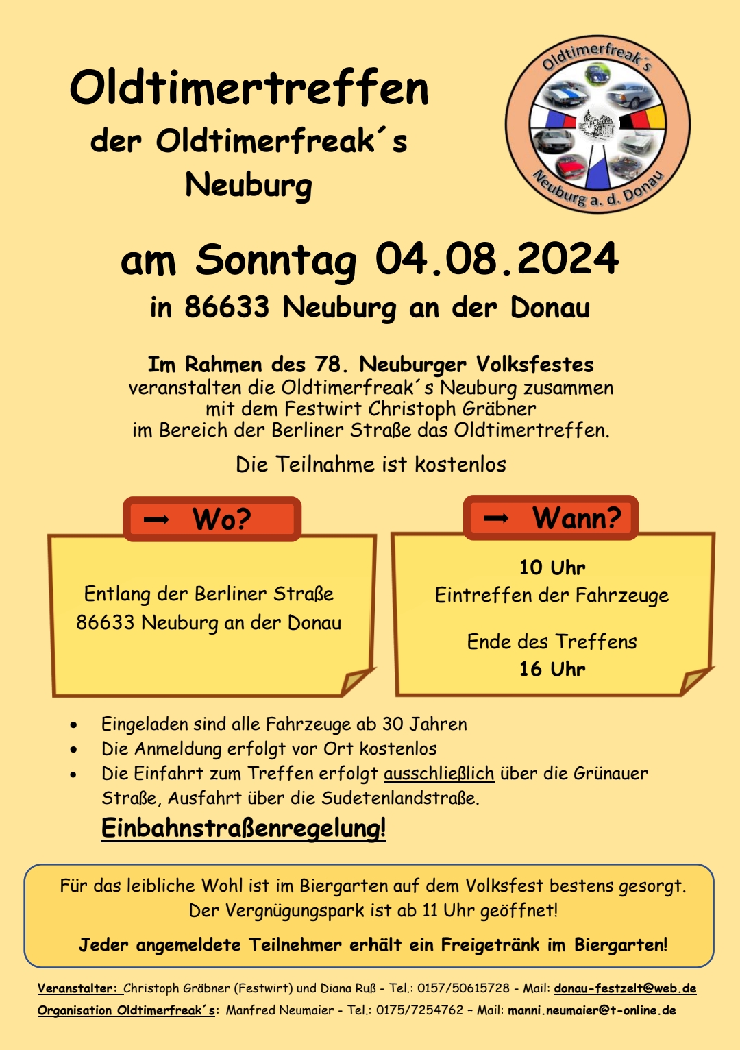 <p>Oldtimertreffen der Oldtimerfreak`s Neuburg am 04.08.2024.</p> <p>Im Rahmen des 78. Neuburger Volksfestes veranstalten die Oldtimerfreak`s Neuburg zusammen mit dem Festwirt Christoph Gräbner im Bereich der Berliner Straße zwischen Sudetenlandstraße und Rohrenlder Straße das Oldtimertreffen.</p> <p>Beginn ist 10 Uhr - Ende ist 16 Uhr. </p> <p>Eingeladden sind alle Fahrzeuge ab 30 Jahren - die Anmeldung erfolgt vor Ort kostenlos.</p> <p>Jeder angemeldete Teilnehmer erhält ein Freigetränk im Biergarten des 78. Volksfestes.</p>