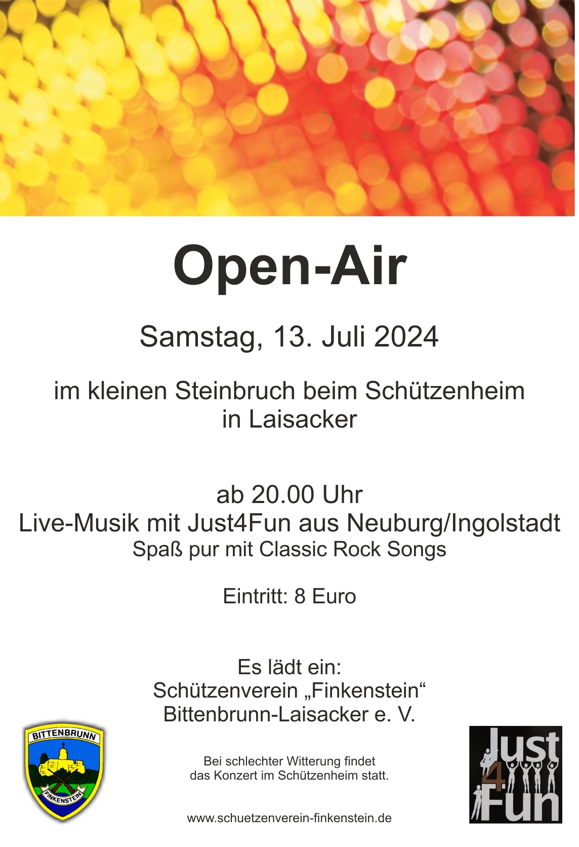 <p><strong>Open-Air Konzert am 13. Juli 2024</strong></p> <p>Am Samstag, den 13. Juli 2024, lädt der Schützenverein „Finkenstein“ Bittenbrunn-Laisacker e. V. zu einem besonderen Open-Air Konzert ein! Ab 20:00 Uhr erwartet euch im kleinen Steinbruch beim Schützenheim in Laisacker Live-Musik mit der Band Just4Fun aus Neuburg/Ingolstadt. Freut euch auf eine unvergessliche Nacht mit Classic Rock Songs und viel Spaß!</p> <p><strong>Eintritt: 8 Euro</strong></p> <p><strong>Einlass ist ab 19:00 Uhr</strong></p> <p>Bei schlechter Witterung findet das Konzert im Schützenheim statt.</p> <p>Kommt vorbei und genießt einen Abend voller Musik und guter Stimmung!</p>