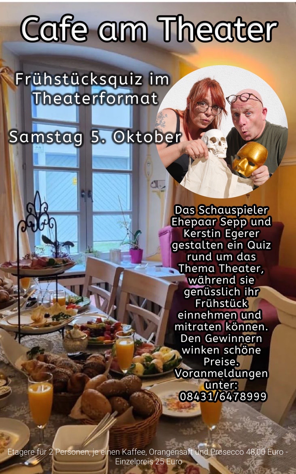 <p style="text-align:justify">Das Schauspieler Ehepaar Sepp und Kerstin Egerer gestalten ein Quiz rund um das Thema Theater, während ihr genüsslich euer Frühstück einnehmen und mitraten können. Den Gewinnern winken schöne Preise.</p> <p style="text-align:justify">Etagere für 2 Personen, je einen Kaffee, Orangenstaft und Prosecco 48,00 € (Einzelpreis 25,00 €)</p> <h4>Voranmeldung:</h4> <p><strong>Café am Theater</strong><br /> Tel. 08431 6478999</p>