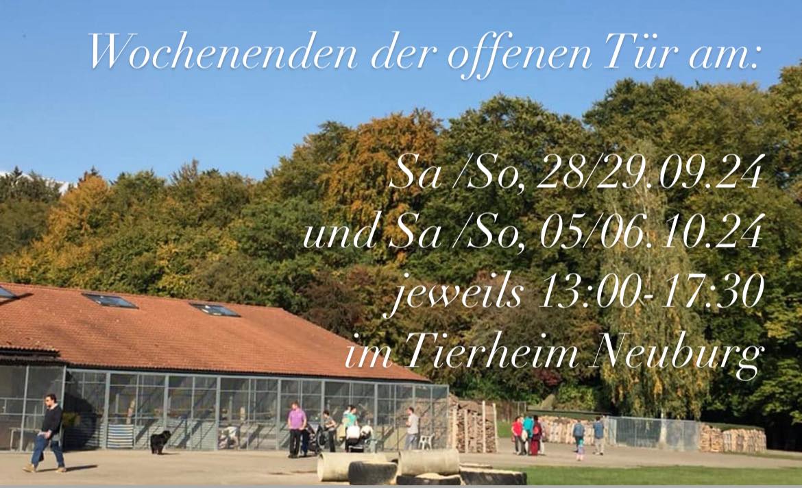 <p>Wir laden Sie herzlich ein zum Tag der offenen Tür im Tierheim Neuburg. Verschaffen Sie sich einen Einblick in die Welt des Tierschutzes in unserer Tierschutzeinrichtung. Erkunden Sie das ehemalige Schießplatz-Gelände zu Fuß oder ganz bequem vom Tierheim-Express aus. Gönnen Sie sich eine Verschnaufpause bei Kaffee & Kuchen, Softdrinks und Pommes. Versuchen Sie Ihr Glück an unserer Tombola, um einen von vielen tollen Preisen zu gewinnen. Erhalten Sie Informationen rund um das Thema Tierschutz, uvm. Wir freuen uns auf viele Besucher, spannende Unterhaltungen und einen regen Austausch.</p> <p> </p> <p>Alle Tage der offenen Tür auf einen Blick:<br /> Samstag, 28.09.2024<br /> Sonntag, 29.09.2024</p> <p>Samstag, 05.10.2024<br /> Sonntag, 06.10.2024</p> <p>jeweils von 13:00-17:30 Uhr.</p>