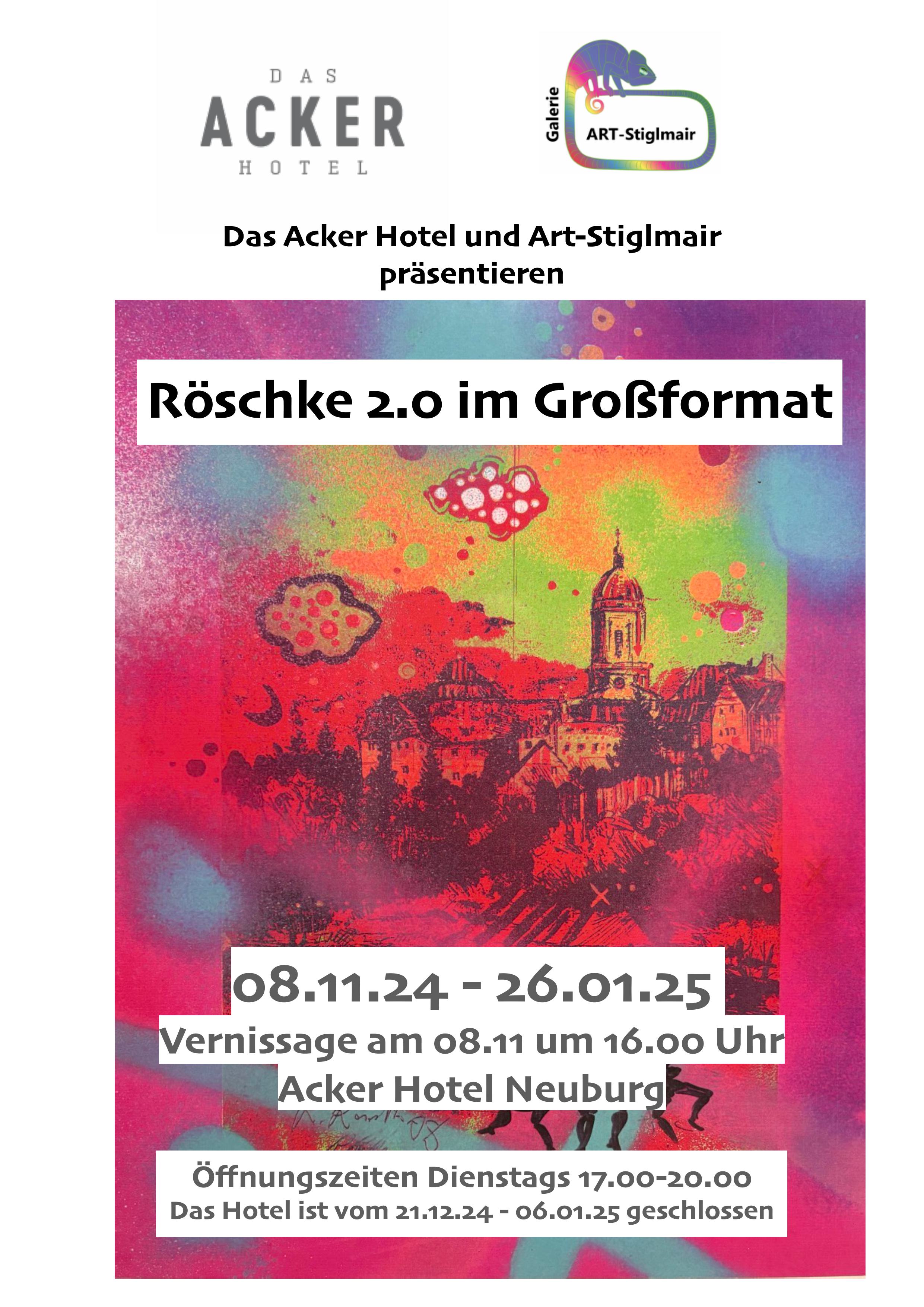 <h5 style="text-align:justify">Laufzeit bis 26. Januar</h5> <p style="text-align:justify">Das Acker Hotel lädt zu seiner ersten Ausstellung ein. In Kooperation mit Art-Management Stiglmair konnten wir den bekannten Neuburger Künstler Rainer Röschke gewinnen, mit seinen Arbeiten unseren Gängen einen neuen Glanz zu verleihen. Unter dem Titel „Röschke 2.0 im Großformat“ verbirgt sich, dass Originalarbeiten vom Künstler durch Digital-Druck auf Leinwand und andere Materialien entsprechend vergrößert wurden. Gezeigt werden insbesondere Tiermotive, Neuburg Ansichten oder Köpfe in verschiedenen Variationen. 2.0 bedeutet an der Stelle, dass durch das neue Format und die Drucktechnik letztlich eine neue Wertigkeit des Bildes entsteht.</p> <p style="text-align:justify">Die Ausstellung kann zu den unten angegebenen Öffnungszeiten besichtig werden – das Acker Hotel spendiert Besuchern einen Getränke-Gutschein, der im Anschluss in der Acker Alm eingelöst werden kann.</p> <p> </p> <h4 style="text-align:justify">Vernissage Freitag, 8. November</h4> <p style="text-align:justify">Am Fr, 8. November um 16:00 Uhr wird die Ausstellung in den Räumen des Acker Hotel eröffnet. Bei der Vernissage werden Sie Interessantes und Persönliches über den Künstler im Rahmen eines Gesprächs zwischen Rainer Röschke und Gerhard Stiglmair erfahren. Für eine musikalische Umrahmung und das leibliche Wohl in Form von Getränken wird gesorgt.</p> <p style="text-align:justify"> </p> <h4 style="text-align:justify">Öffnungszeiten</h4> <p>Dienstags von 17:00 bis 20:00 Uhr</p> <p><em>Im Zeitraum vom 22.12.2024 bis 07.01.2025 ist das Acker Hotel geschlossen.</em></p>